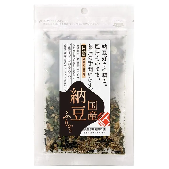 宮城県産大粒大豆を使用した乾燥納豆に、かつお、昆布、海苔とアクセントに辛子をブレンドした具沢山ふりかけです。乾燥納豆は納豆特有の気になるにおいも少なく、苦手な方でも美味しく食べれます。たまごかけご飯にふりかけるのもおすすめです。 内容量:20g 原材料名:いりごま(国内製造)、乾燥納豆(大豆(宮城県産)納豆菌)、あられ、昆布粒、食塩、焼海苔、乾燥わけぎ、からし粉、かつお節、砂糖、酵母エキス、しょうゆ(大豆・小麦を含む) 賞味期限:180日 栄養成分表示:(100gあたり)エネルギー/456kcal、たんぱく質/24.4g、脂質/24.8g、炭水化物/33.9g、食塩相当量/8.38g アレルギー:小麦、大豆、ごま お召し上がり方 ♦ふりかけとして 温かいご飯にかけたり、おにぎりに ♦冷奴にかけて ♦たまごかけご飯にふりかけるのもおすすめ