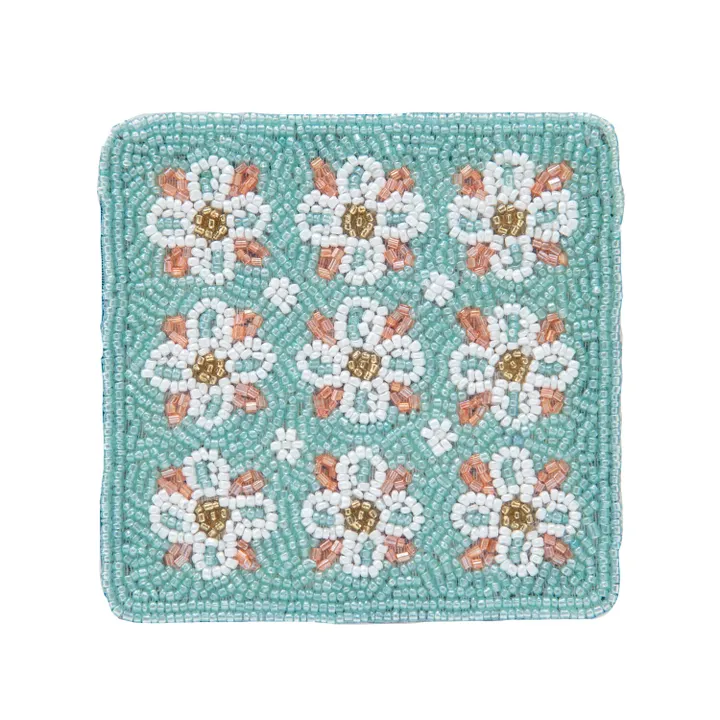 全体的にくすんだカラービーズを使いレトロな雰囲気が感じられるコースターは、台湾のマジョリカタイルをモチーフにしています。 クリアガラスはもちろん、カラーガラスに合わせてご使用いただくと素敵です。