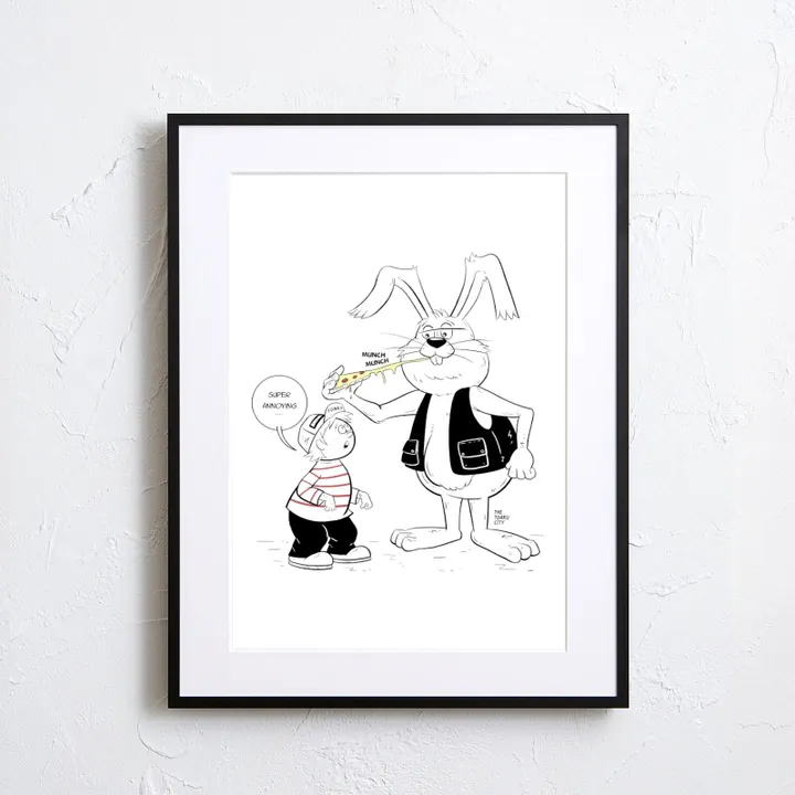 【現代アートポスター】アメリカンポップ コミカル モノトーン うさぎ 子ども ピザ イラスト A4(S) フレームセット:黒 29.4×38.4cm