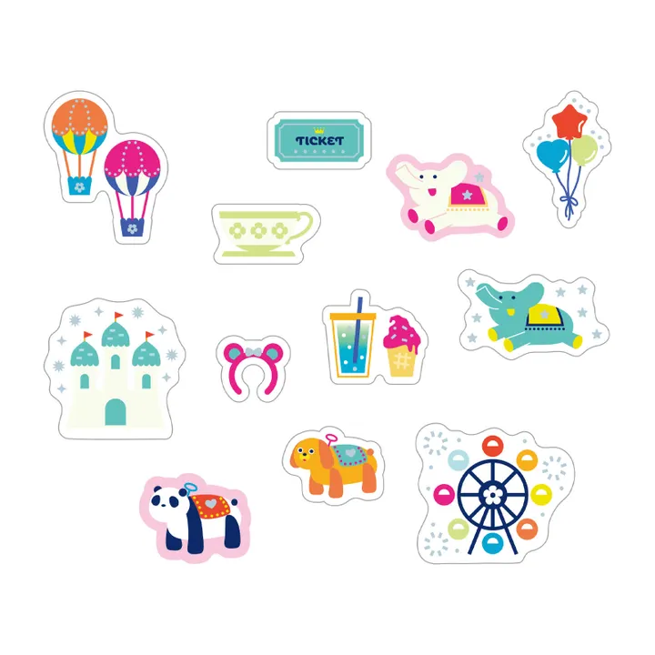 【 キラキラクリアシール Theme park 】 ★★キラキラマステのフレークシール版!  箔押しが魅力の「キラキラマステ」をクリアタイプのフレークシールとして 新たにシリーズ化した【キラキラクリアシール第3弾!】 『 レインボーオーロラ箔 』 による、8柄展開★★ ゴールド箔がのった遊園地モチーフのちょこっとレトロ感のあるデザイン。 見るだけで思わず心がときめきます…? ノートやカレンダーの端に貼ったり、ファイルケースや瓶・クリアボトル など、いろんなものを可愛くデコレーションできちゃいます♪ PET素材ならではの【透明度×やわらかさ×粘着】が 紙素材へのデコレーションだけでなく 身の回りの小物デコレーションにも馴染みます♪