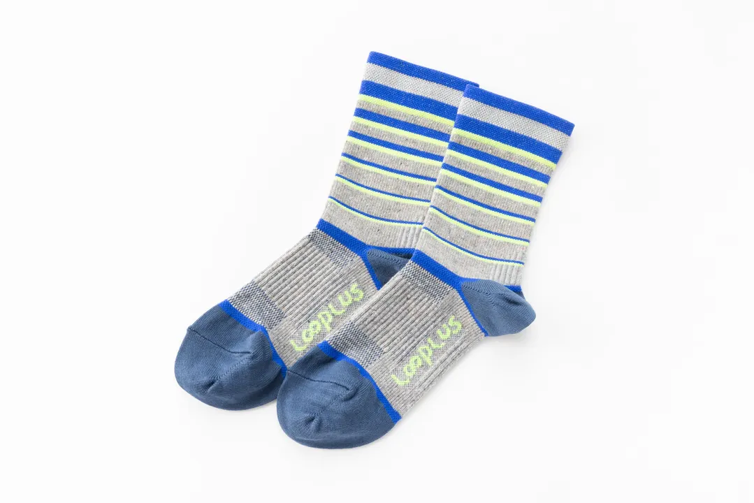 一日中履いてもズレず、しっかりペダリングができる。 アップサイクル糸「Looplus(ループラス)」を使用した自転車ソックスに、カラフルなボーダー柄の新モデルが誕生しました。 「環境に配慮したソックスは良いけれど、グレー一色だと地味に感じる」 「せっかくなら、自転車ライドに映える明るいデザインが欲しい」 そんな声にお応えして生まれたのが、今回のボーダー柄ラインです。カラーバリエーションは6色。愛車のカラーやウェアに合わせて、自由に選べる楽しさがあります。丈はやや長めのミドル丈で、くるぶし丈の自転車スパッツと組み合わせても地肌が見えにくい仕様となっています。 本体に使用している「Looplus(ループラス)」は、繊維製品の製造過程で生まれる端材や編みくずなどを再利用して作られたアップサイクル素材です。クラボウが開発したこの糸は、廃棄されていた素材を新しい糸としてよみがえらせ、資源使用量の削減に貢献します。そのため本体の色はミックス調の風合いとなり、環境配慮型素材ならではの表情が特徴です。 機能面では、自転車ソックス(RING-KOソックス)をベースに、Looplusに最適となる編み設計へ改良。伸縮性の高い編み方を採用し、走行中の足とソックスのズレや回転を防ぎます。つま先と踵にはマイクロファイバーを使用し、グリップ力を向上。また、再帰反射糸を一部に取り入れることで、夜間走行時の視認性にも配慮しています。