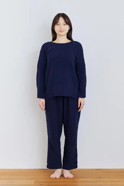 先行して展開していたルームパンツをご愛用の方々をはじめ、たくさんのご要望をいただいておりましたトップスが、ようやく発売となりました。 ふわふわの肌触りが地肌に気持ちよく、サラッとした着心地でありながら、3重織りのガーゼがしっかり保温してくれるので、その軽さ、薄さからすると意外なほどあたたかさがあります。春、秋冬と幅広いシーズンに活躍してくれます。 身幅と、袖丈、アームホールがやや大きめのつくりで、ざっくりとしたシルエットのデザインなので、体のラインを拾いません。 また、ネックホールは着脱時のストレスがない、ややゆったりめの仕様ですが、かがんだ姿勢でも開きすぎないつくりです。 全工程日本製、ホルマリン検査済みで、敏感肌の方でも安心してお使いいただけます。 パジャマ、部屋着などルームウェアとして、そして、ちょっとそこまでお出かけするワンマイルウェアとして、くらしの中のいろんな場面で活躍してくれます。 部屋干しでも乾きやすいので、それほどたくさんの洗い替えも必要ありません。 いつもどおりのお洗濯方法で遠慮なく洗えます。 シワも気になりづらい生地なので、ぜひ気兼ねなくいろんなシーンでお使いください。 サイズはS、M、L、XLがあります。男女兼用となっています。身長やお好みのサイズ感に合わせてお選びください。