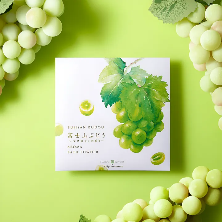 果実感あふれるみずみずしいマスカットの色と香りのパウダー入浴剤。 富士山に一番近いと称される「富士山ワイナリー」。 自然豊かなこのワイナリーで育った「甲州ブドウ」からワインを製造する際にでるワインパミス(残渣)から独自に美容成分「甲州ブドウエキス※1」を抽出配合。 パパイン※2が古い角質やタンパク汚れをやさしく洗い落とす入浴剤です。 果実感あふれるみずみずしいマスカットの香り。 ※1 ブドウ果実エキス ※2 パパイン ※テスターや什器をご希望の場合※ 本商品ご注文時に香りテスター(00603)、什器(00136)をご入用の旨をお申し付けください。 本商品の発送完了後、追加でテスター、什器のみのご注文を頂いてもお受けできませんのでご注意ください。