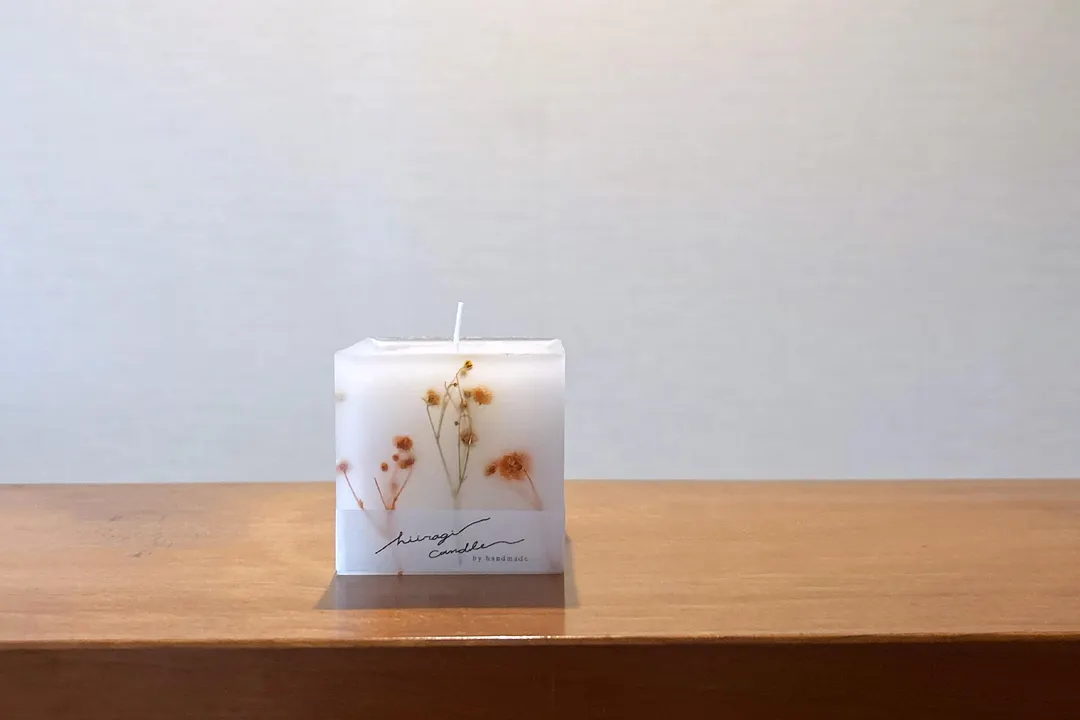 手のひらサイズのキューブ型キャンドル ミニサイズでお手軽プライスで キャンドル初心者さんにもおすすめです ボタニカルキャンドルといえば、キャンドルの中では定番の人気キャンドルで、 盛りだくさんのお花が詰め込まれたデザインのものが多く見られますが このボタニカルキャンドルはあえて小さな花と細い枝を閉じ込めた、 華奢で儚いボタニカルキャンドルです 植物のシルエットが浮かび、幻想的な空間を演出します この花々がオレンジの炎に照らされ、映し出される光景は、 確かに儚く美しく繊細 ホワイトスペースの多いキャンドルなので、 よくあるボタニカルキャンドルのような派手さはある華やかさはありませんが、 シンプルながら、インテリアとして飾って置くだけでも、 日常の中で些細な彩りを与えてくれる、程よい空気感を作り出してくれるような気がします 画像のものとはイメージが異なる場合がございます。 ※花材の量・細かな位置はご指定いただけません /////////////////////////////////////////////////// お好みの色と香りを選べます 〈ピンク&ブルーグリーンと無香料〉 〈イエロー&オレンジと無香料〉 〈ピンク&ブルーグリーンとホワイトティーの香り〉 〈イエロー&オレンジとシトラスの香り〉 〈カラフルと無香料〉 ———————— size:55×55×H50mm material:パラフィンワックス、マイクロソフトワックス、ステアリン酸、香料、綿芯、花材 燃焼時間:約14H(気温・空調・環境により異なる) ———————— Made in Japan ・・・・・・・・・・・・・・・・・・・・・・・・・・ 『ひいらぎキャンドルの〈botanical〉シリーズ』 ひいらぎキャンドルのbotanicalに使用しているものの多くは 捨てられる花をドライフラワーとして再利用したお花です。 役目を終えた花束をそのまま破棄することなく ロウに閉じ込め、灯りに照らされることにより 再び、花としての息吹を放ちます。 ※一部、市販の花材を使用しています ・・・・・・・・・・・・・・・・・・・・・・・・・・ ひいらぎキャンドルでは、 キャンドルは一点一点全て手作業で作成しています。 キャンドル本体の製作だけでなく、ラベルやパッケージのデザイン、シールの貼り付け、 梱包など、キャンドルが生まれるところから旅立つまでの間の全ての制作作業を 自身で行なっております。 【ご注意点】 <こちらの商品は受注生産になります> ・香りの良い新鮮なものをお届けする為、注文を頂いてからお作りしています ・1つ1つ丁寧に作成しておりますがハンドメイドの為に画像と同じ作品は作れません 手作業のため大きさに多少の誤差・お色味や形状が若干異なる場合がございます ・お客様よりご注文を頂いてから、すぐに製作に入らせて頂きます 途中でのデザインや素材など一切の変更、製作のキャンセルはお受けすることが出来ません ・注文日より1週間以内に発送しておりますが、 お急ぎの方・ご希望納期のある方は必ず事前にお知らせ下さい。 配送地域、交通事情、素材の在庫等の理由により遅延する場合がございます お届けまでに2週間ほどかかる場合もございます どうぞ余裕を持ってご購入くださいませ ○火を取り扱う製品となります。「attention」という注意事項を同封致しますので、 必ずお読みいただきご使用下さいますよう宜しくお願いいたします。 ※当店のキャンドルをご使用の上で起きた事故についての責任は負いかねます※ 予めご了承ください
