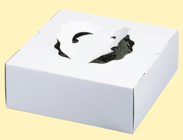 定番の手提げ白無地パイ箱。 タルトやパイ、チーズケーキにぴったりです。 通年お使い頂けます。 表面はツヤありの白無地になっています。 ※こちらの商品はトレーはついておりません。 サイズは5号、6号、7号の3サイズの展開です。 5P(5号):内寸188×188×H85 1ロット100枚 1枚あたり84円 6P(6号):内寸220×220×H75 1ロット100枚 1枚あたり89円 7P(7号):内寸250×250×H75 1ロット100枚 1枚あたり104円 ※5号のみH85mmです。