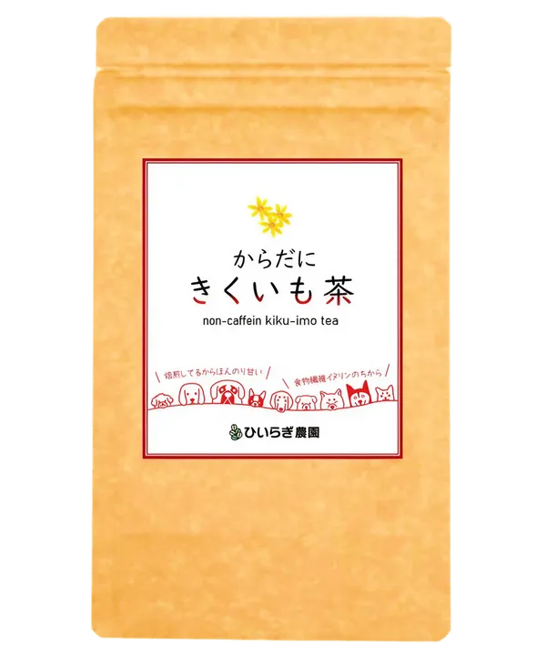 土と堆肥の力だけで育てた山口県産きくいもを皮ごと乾燥させ、独自の焙煎で香ばしく仕上げたノンカフェインの飲みやすいお茶です。 ◉「山口グッと産品」認定品 「山口グッと産品」とは、山口県産の農林水産物を使い、6次産業化・農商工連携の取り組みにより開発された、質の高い商品として認定されたものです。 ◉ひいらぎ農園のきくいも茶の特長 栽培期間中、農薬を使用せずに丁寧に育てたきくいもを使用しています。 きくいもは鮮度が落ちやすい野菜です。そのため、土から掘り起こした後、洗浄してすぐに乾燥加工しています。 独自の焙煎製法により、香ばしくほんのり甘い味わいに仕上げています。 ホットでお楽しみいただくと香りと風味が引き立ちます。 原材料はきくいものみ。ティーバッグの出涸らしもそのまま食材としてお使いいただけます。 お料理やおつまみとしても活用可能です。 ◉飲み方 カップやタンブラーにティーバッグ1包を入れ、お湯を注いで約3~5分蒸らしてお召し上がりください。 煮出す場合は、沸騰させた1リットルのお湯にティーバッグ1~2包を入れ、弱火でことこと煮出してください。 ◉お茶以外の楽しみ方 お茶漬けに加える みそ汁に入れて風味付けに 焼酎などのお飲み物にブレンド ティーバッグから中身を取り出してそのままおやつやふりかけとして 出涸らしを納豆やサラダに混ぜて料理に活用