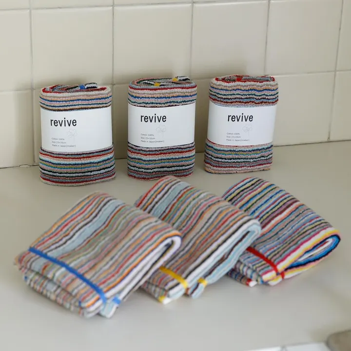 【今治の一期一会ECOタオル】ネオ・リバイブ  クロス 上質な残り糸を組み合わせて作った、環境にやさしい自然派タオル。 通常のタオルに使用する2倍もの糸を贅沢に使い、ボリューム感はもちろんのこと吸水性も抜群です。 残糸を使用しているため、同じ色目のものはなく視覚でも楽しめる、一期一会タオルです。 一点、一点、帯付きなのでちょっとしたギフトにも最適です。 厚手で丈夫なタオルなので長くお使いいただけます。通常のタオルとしてはもちろん、インテリアのアクセントとしてもおすすめです。 ※残り糸を使用していますので、生産ロットによって色目が変わります。 ※JANシールの発行を希望される場合は、ご注文の際にメッセージをお願いいたします。