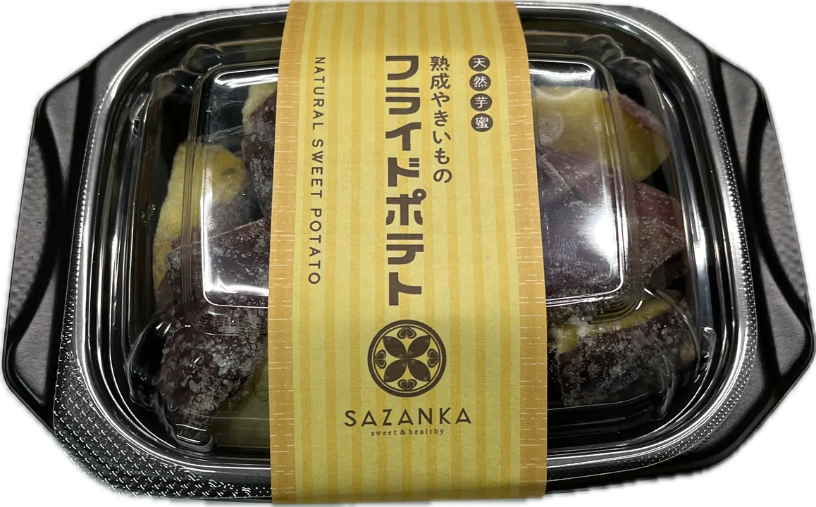 宮崎県宮崎市田野町の自社有機土壌で栽培する自社ブランドSAZANKA熟成やきいも”を揚げてフライドポテトに仕上げました。 砂糖不使用で大学芋のような美味しさです。 加熱する場合はレンジで600wで1分半~3分。冷蔵保存で冷やし焼き芋としても提供可能
