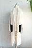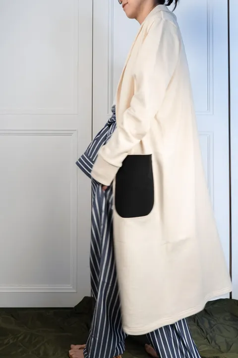 ●ワードローブに欠かせないスタンダードアイテム -DESIGN- 横幅のあるボクシーなフォルムは、大切な人とシェアできる嬉しいサイジング。 裏起毛のスエット生地は綿毛のようなフワフワとした肌触りと暖かさ。そして何よりも柔らかさと軽さを味わえる解放感。 頬擦りしたくなる滑らかな風合いは、上質なオーガニックコットンを使用しているから。 袖口のリブやポケットの素材の細部にまで環境とデザインを両立させたこだわり。 ●裏起毛素材は、春先が真骨頂 春先は冬物素材を脱ぎ、いち早く春気分を迎えたいですよね。 でも、まだまだ外は寒い...。 そんな時に、裏起毛の素材は便利です。 暖かくもあり、ゆったりサイズのカーディガン。 インナーに暖かいものを着、脱ぎ着できることで体温調整をしてください。 ●触り心地の良さは、感情の不安定さやストレスを軽減させる効果があるのです もちろん街着として。そのまま夜は優しさに抱きしめられながらリラックスタイムで心がほぐれる瞬間を。 一日中優しさにつつまれながら、幸福感を身に纏う。 実は、触り心地の良さは愛情ホルモンと称されるオキシトシンの分泌を促します。 女性ホルモンの一つであるエストロゲンとの関係も深く、オキシトシンを増やすことで免疫力や傷を癒す力を高め、かつ感情の不安定さやストレスを軽減させる効果があります。 -MATERIAL- ●ラフさが魅力のスエット生地は、洗えるところがポイント デイリーユースだからこそ、洗って着続けられるところも嬉しい。状態が良いまま長く保たれ、型崩れすることも少ない。それは素材のクオリティの高さがあるから。 ●持続可能素材 ポケットに使用している人工皮革は、東レのウルトラスエードを使用しています。 優れた耐久性とリサイクルPETを紡いだ持続可能素材です。 弊社の洗濯試験により、丸洗いができることも実証済みです。 (洗濯後は速やかに干すようにしてください。濡れたまま放置しますと、色移りの原因になります。) 一度着たら手放せないぬくもりrobe。心と身体が満たされ、大切な人やペットとのスキンシップもはずむことでしょう。 そして、より一層の愛情や絆を深め、豊かな暮らしを送る、そんなアイテムをご提供します。