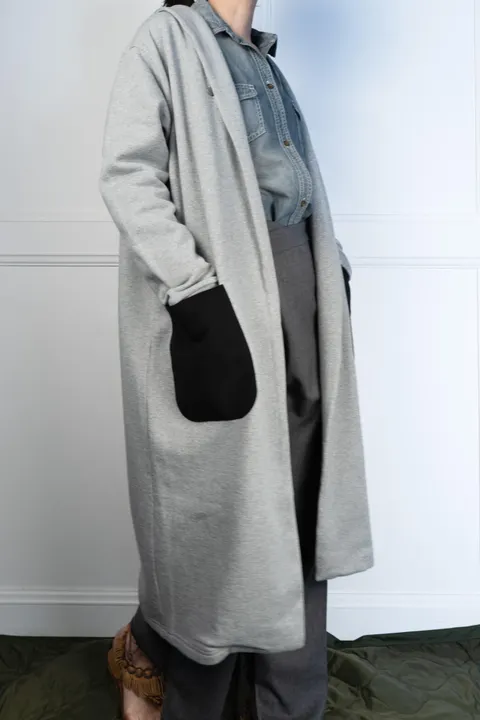 ●ワードローブに欠かせないスタンダードアイテム -DESIGN- 横幅のあるボクシーなフォルムは、大切な人とシェアできる嬉しいサイジング。 裏起毛のスエット生地は綿毛のようなフワフワとした肌触りと暖かさ。そして何よりも柔らかさと軽さを味わえる解放感。 頬擦りしたくなる滑らかな風合いは、上質なオーガニックコットンを使用しているから。 袖口のリブやポケットの素材の細部にまで環境とデザインを両立させたこだわり。 ●裏起毛素材は、春先が真骨頂 春先は冬物素材を脱ぎ、いち早く春気分を迎えたいですよね。 でも、まだまだ外は寒い...。 そんな時に、裏起毛の素材は便利です。 暖かくもあり、ゆったりサイズのカーディガン。 インナーに暖かいものを着、脱ぎ着できることで体温調整をしてください。 ●触り心地の良さは、感情の不安定さやストレスを軽減させる効果があるのです もちろん街着として。そのまま夜は優しさに抱きしめられながらリラックスタイムで心がほぐれる瞬間を。 一日中優しさにつつまれながら、幸福感を身に纏う。 実は、触り心地の良さは愛情ホルモンと称されるオキシトシンの分泌を促します。 女性ホルモンの一つであるエストロゲンとの関係も深く、オキシトシンを増やすことで免疫力や傷を癒す力を高め、かつ感情の不安定さやストレスを軽減させる効果があります。 -MATERIAL- ●ラフさが魅力のスエット生地は、洗えるところがポイント デイリーユースだからこそ、洗って着続けられるところも嬉しい。状態が良いまま長く保たれ、型崩れすることも少ない。それは素材のクオリティの高さがあるから。 ●持続可能素材 ポケットに使用している人工皮革は、東レのウルトラスエードを使用しています。 優れた耐久性とリサイクルPETを紡いだ持続可能素材です。 弊社の洗濯試験により、丸洗いができることも実証済みです。 (洗濯後は速やかに干すようにしてください。濡れたまま放置しますと、色移りの原因になります。) 一度着たら手放せないぬくもりrobe。心と身体が満たされ、大切な人やペットとのスキンシップもはずむことでしょう。 そして、より一層の愛情や絆を深め、豊かな暮らしを送る、そんなアイテムをご提供します。