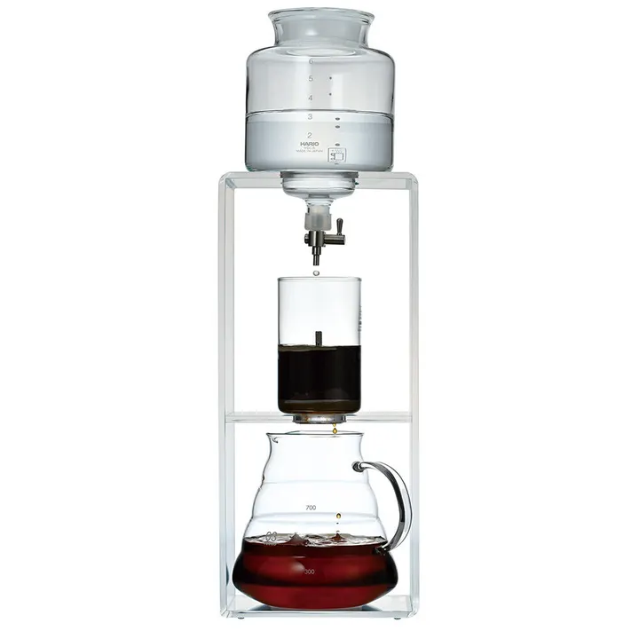 一滴一滴が極上のコーヒーを生み出します。 ポタポタと水を落として、じっくりコーヒーの旨さを抽出します。 インテリア性を重視したシンプルなデザインです。 抽出の滴下速度は金属コックで調節します。 出来上がり容量780ml。