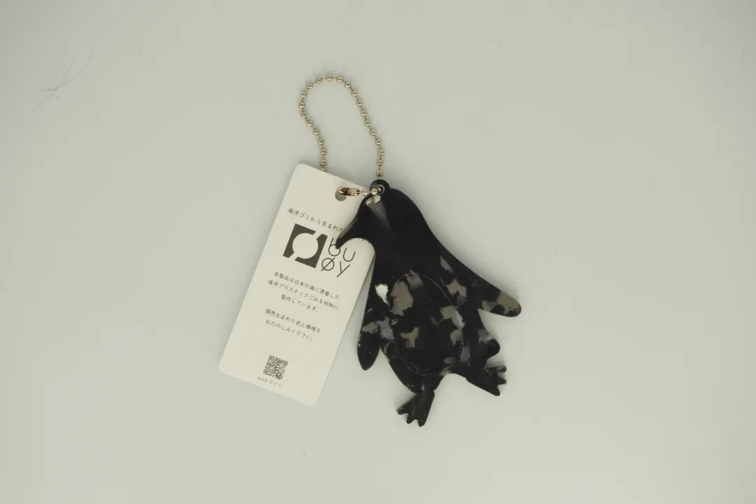 ペンギンの形のキーホルダーです。 buoyの製品は全て日本各地で回収された海洋プラスチックごみを材料に作っています。着色などの加工を加えず、偶然海岸に漂着した色味でできています。 明るい発色が特徴のプラスチックですが、複数の色が交じり合うことでちょっと有機的なモザイク模様が特徴です。 製品にはひとつひとつゴミの漂着地域が明記されています。日本で起きている海洋ごみの問題をリアルに感じることができます。 また、商品に添付されているQRコードを読み込むとそれぞれの回収を行ったビーチクリーン団体さんの情報を見ることができます。 ------------------------------------------------------------------- 海洋プラスチックごみを材料に変える独自技術buoyの特徴 (buoyは海洋プラスチックごみ素材使用を前提にした株式会社テクノラボの独自技術により成形しています。株式会社テクノラボは本技術において特許取得済み) ◆材料を分けないで成形するため生まれる独自の模様 材料はすべて着色せず海洋ごみの色を活かして成形しています。偶然生まれる色と模様は回収された漂着ごみによって決まります。 ◆製品の重さが海洋ごみの重さ 製品をコーティングしているフィルム以外、混ぜ物などせず海洋ごみでできているので製品の重みから海洋ごみ問題を感じられます。 ◆製品にすべて材料の漂着地を明記 buoyは日本各地のビーチクリーンボランティアや企業の方から材料を提供していただいています。これらの材料は時期と地域を分けて管理され、製品にはすべて材料産地のシールを貼り販売しています。 buoyの材料産地をきっかけに回収された地域のことを知ってほしいとの思いからbuoyでは団体様の紹介ページを作成しています。 http://www.techno-labo.com/rebirth/partner/ -------------------------------------------------------------------