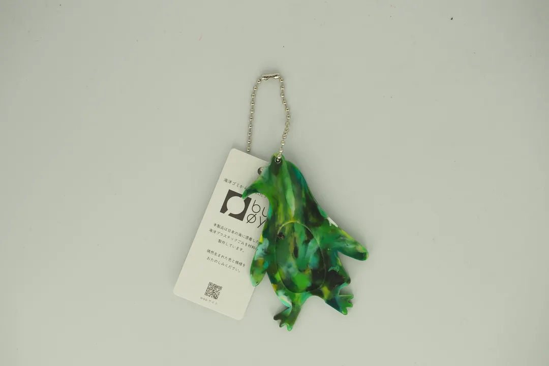ペンギンの形のキーホルダーです。 buoyの製品は全て日本各地で回収された海洋プラスチックごみを材料に作っています。着色などの加工を加えず、偶然海岸に漂着した色味でできています。 明るい発色が特徴のプラスチックですが、複数の色が交じり合うことでちょっと有機的なモザイク模様が特徴です。 製品にはひとつひとつゴミの漂着地域が明記されています。日本で起きている海洋ごみの問題をリアルに感じることができます。 また、商品に添付されているQRコードを読み込むとそれぞれの回収を行ったビーチクリーン団体さんの情報を見ることができます。 ------------------------------------------------------------------- 海洋プラスチックごみを材料に変える独自技術buoyの特徴 (buoyは海洋プラスチックごみ素材使用を前提にした株式会社テクノラボの独自技術により成形しています。株式会社テクノラボは本技術において特許取得済み) ◆材料を分けないで成形するため生まれる独自の模様 材料はすべて着色せず海洋ごみの色を活かして成形しています。偶然生まれる色と模様は回収された漂着ごみによって決まります。 ◆製品の重さが海洋ごみの重さ 製品をコーティングしているフィルム以外、混ぜ物などせず海洋ごみでできているので製品の重みから海洋ごみ問題を感じられます。 ◆製品にすべて材料の漂着地を明記 buoyは日本各地のビーチクリーンボランティアや企業の方から材料を提供していただいています。これらの材料は時期と地域を分けて管理され、製品にはすべて材料産地のシールを貼り販売しています。 buoyの材料産地をきっかけに回収された地域のことを知ってほしいとの思いからbuoyでは団体様の紹介ページを作成しています。 http://www.techno-labo.com/rebirth/partner/ -------------------------------------------------------------------