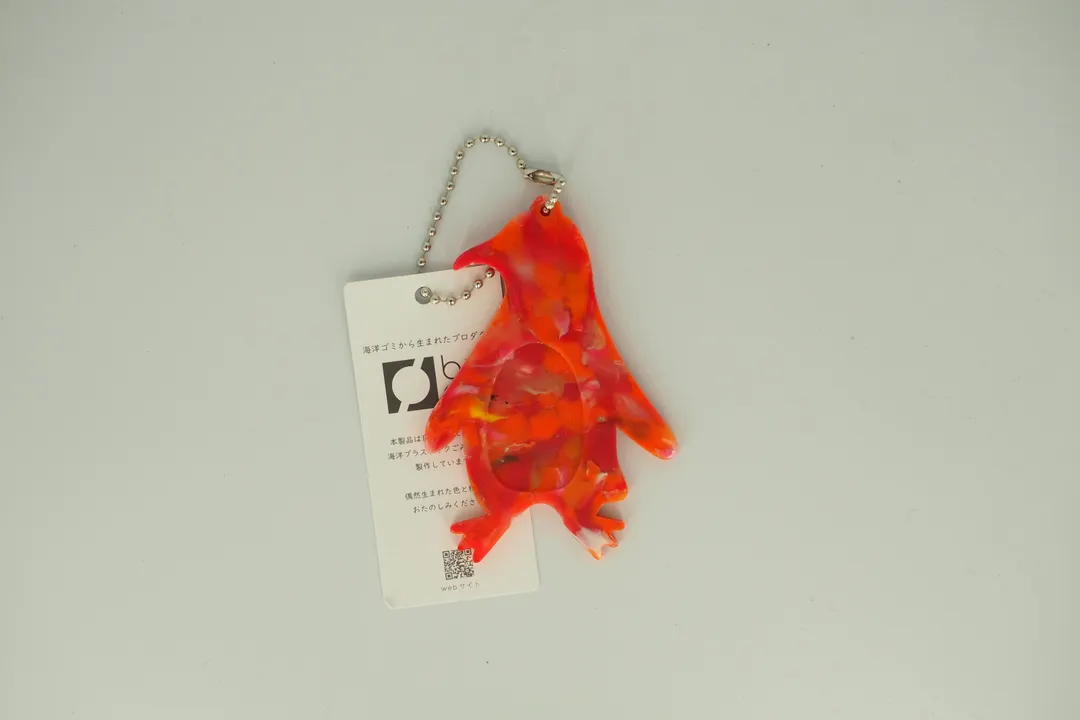 ペンギンの形のキーホルダーです。 buoyの製品は全て日本各地で回収された海洋プラスチックごみを材料に作っています。着色などの加工を加えず、偶然海岸に漂着した色味でできています。 明るい発色が特徴のプラスチックですが、複数の色が交じり合うことでちょっと有機的なモザイク模様が特徴です。 製品にはひとつひとつゴミの漂着地域が明記されています。日本で起きている海洋ごみの問題をリアルに感じることができます。 また、商品に添付されているQRコードを読み込むとそれぞれの回収を行ったビーチクリーン団体さんの情報を見ることができます。 ------------------------------------------------------------------- 海洋プラスチックごみを材料に変える独自技術buoyの特徴 (buoyは海洋プラスチックごみ素材使用を前提にした株式会社テクノラボの独自技術により成形しています。株式会社テクノラボは本技術において特許取得済み) ◆材料を分けないで成形するため生まれる独自の模様 材料はすべて着色せず海洋ごみの色を活かして成形しています。偶然生まれる色と模様は回収された漂着ごみによって決まります。 ◆製品の重さが海洋ごみの重さ 製品をコーティングしているフィルム以外、混ぜ物などせず海洋ごみでできているので製品の重みから海洋ごみ問題を感じられます。 ◆製品にすべて材料の漂着地を明記 buoyは日本各地のビーチクリーンボランティアや企業の方から材料を提供していただいています。これらの材料は時期と地域を分けて管理され、製品にはすべて材料産地のシールを貼り販売しています。 buoyの材料産地をきっかけに回収された地域のことを知ってほしいとの思いからbuoyでは団体様の紹介ページを作成しています。 http://www.techno-labo.com/rebirth/partner/ -------------------------------------------------------------------