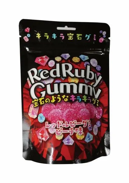 【宝石のようなキラキラグミ】 まるでルビーを散りばめたようなザクザク食感の大粒ピーチ味グミです。