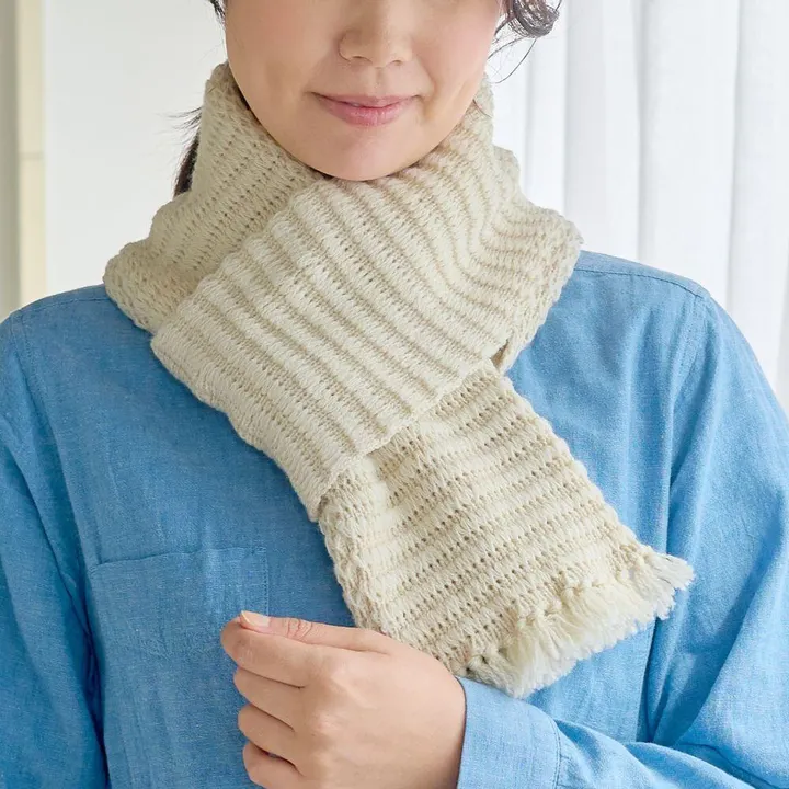 羊をイメージしたトンネル編みの地模様が特徴の、フリンジ付きミニマフラー。 立体感のある編地が、ほっこりとした温もりを演出します。 コンパクトながら存在感のあるデザインで、コーディネートのアクセントにもぴったり。 寒い季節に優しく寄り添う、癒しのマフラーです。 ウールは暖かく吸水性、吸湿性に優れた天然素材です。一方のアクリルはウールに似せて作られた合成繊維で、ふっくらとやわらかく保温性、耐久性が高く、乾きやすさが特徴です。ウールには縮み、アクリルには吸水性、吸湿性が低いなど、それぞれにデメリットもありますが、合わせることによって弱点を補った素材になっています。