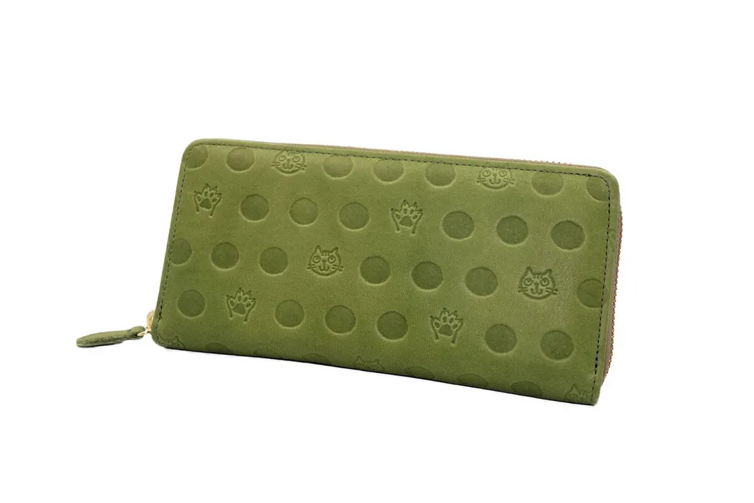 猫と肉球の型押しが「大人可愛い!」/日本製の牛革財布・ギャルソン型小銭入れ・抗菌・抗ウイルス加工・ファスナータイプ 鶯色(うぐいすいろ)グリーン
