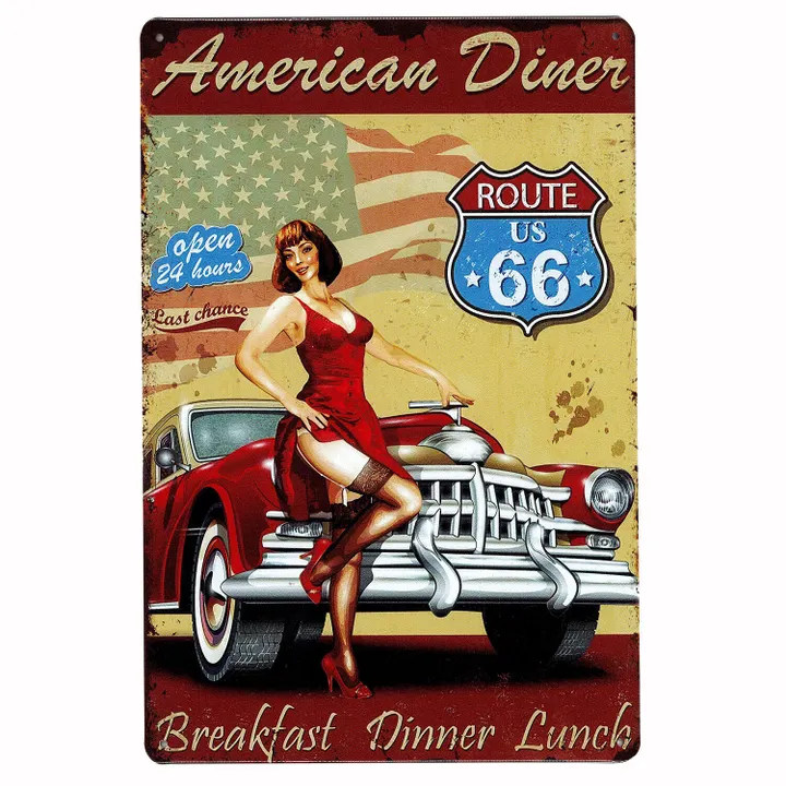 人気のアメリカンデザインのビンテージ風サインボードです。こちらはA4サイズに近いサイズです。 お部屋・ガレージ・お店・カフェ・店舗のイメージ作りやイメージアップ、ディスプレイ、お部屋のインテリア、壁飾り、催し物、など幅広く活躍します!また掛けやすいように穴が開いているので取り付けも簡単です。  スチールの看板はアメリカ各地で街頭広告、店内用看板として商用看板として用いられています。 アメリカンスタイルのデザインなのでお部屋やガレージをアメリカスタイルに装飾可能です。 DIY、エイジング塗装、アンティーク塗装、男前系 などのリメイク家具やリメイク雑貨とも相性抜群です。 錆びているように見えますが実際には錆びておりませんのでお部屋を汚すことなく飾っていただけます。