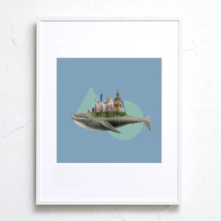 【現代アートポスター】鯨 街並み イラスト 写真 おしゃれコラージュ A4(S) フレームセット:白 29.4×38.4cm