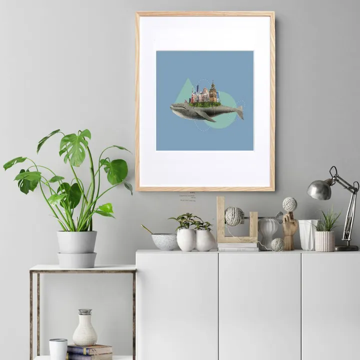 【現代アートポスター】鯨 街並み イラスト 写真 おしゃれコラージュ A3(M) フレームセット:無垢 41.0×52.5cm