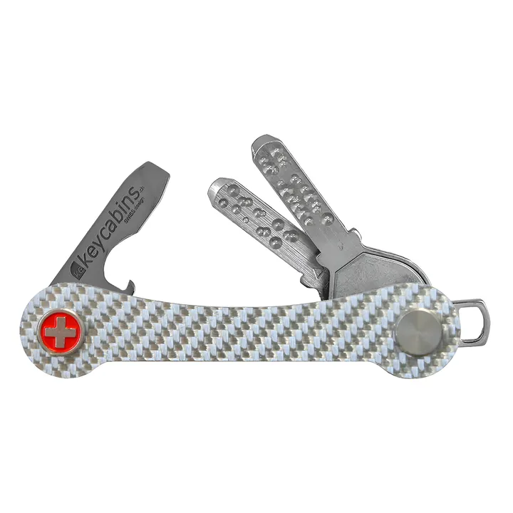 スイス・アーミーナイフのように複数の鍵をスタッキングする、スイス生まれのキーオーガナイザー。 鍵をジャラジャラさせずに、スマートに持ち歩く。 【keycabinsの特徴】 ①複数の鍵をスタッキングして収納し、静かにコンパクトに持ち歩く。 ②鍵同士がぶつかって耳障りな音を立てることがなくなり、静かに。音が静か=外出・帰宅を周囲に知らせないので、防犯面で安心。 ③鍵を使うときのアクションが少なく、ストレス軽減。 複数の鍵を持っていると、目当ての鍵に一発でアクセスするのは難しい。一般的なキーケースは①キーケースを開き、②鍵を選ぶ、というアクションですが、keycabinsは鍵の位置が固定されているので、目当ての鍵へのアクセスが早く、片手で使えてスムーズ。 ④鍵を開け閉めする際に心地良さがある。この心地良さは、短いドライバーより、長いドライバーを使うとネジが締めやすいのに似た感覚です。 【カーボンタイプの特徴】 カーボン素材は、非常に軽く、硬くて傷に強く、頑丈。レーシングカーをはじめとして、さまざまな最先端機器に使われている注目の素材、耐水性にも優れています。カーボンの織りは綾織りタイプで、斜め模様がスタイリッシュです。 ブラック、シルバー、ライトブルー、ゴールドの順に人気があります。
