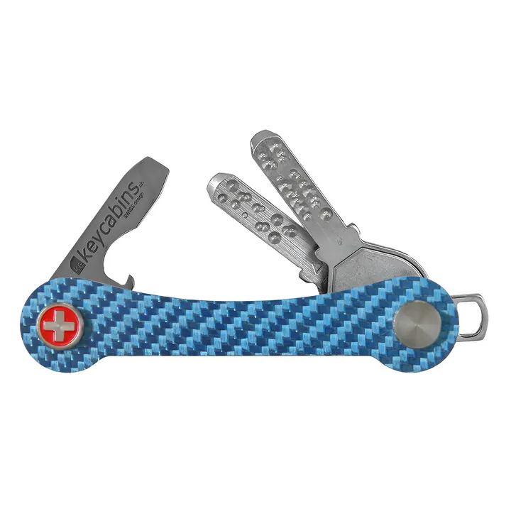スイス・アーミーナイフのように複数の鍵をスタッキングする、スイス生まれのキーオーガナイザー。 鍵をジャラジャラさせずに、スマートに持ち歩く。 【keycabinsの特徴】 ①複数の鍵をスタッキングして収納し、静かにコンパクトに持ち歩く。 ②鍵同士がぶつかって耳障りな音を立てることがなくなり、静かに。音が静か=外出・帰宅を周囲に知らせないので、防犯面で安心。 ③鍵を使うときのアクションが少なく、ストレス軽減。 複数の鍵を持っていると、目当ての鍵に一発でアクセスするのは難しい。一般的なキーケースは①キーケースを開き、②鍵を選ぶ、というアクションですが、keycabinsは鍵の位置が固定されているので、目当ての鍵へのアクセスが早く、片手で使えてスムーズ。 ④鍵を開け閉めする際に心地良さがある。この心地良さは、短いドライバーより、長いドライバーを使うとネジが締めやすいのに似た感覚です。 【カーボンタイプの特徴】 カーボン素材は、非常に軽く、硬くて傷に強く、頑丈。レーシングカーをはじめとして、さまざまな最先端機器に使われている注目の素材、耐水性にも優れています。カーボンの織りは綾織りタイプで、斜め模様がスタイリッシュです。 ブラック、シルバー、ライトブルー、ゴールドの順に人気があります。