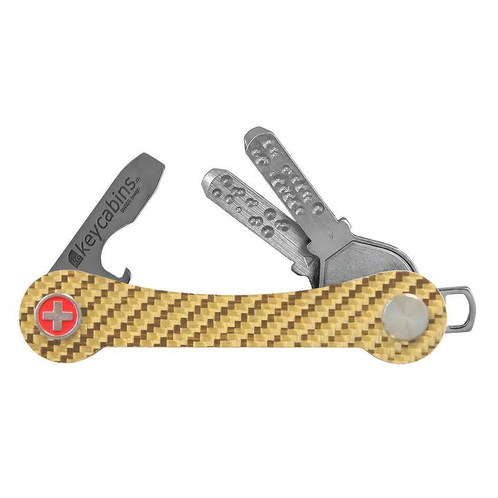 スイス・アーミーナイフのように複数の鍵をスタッキングする、スイス生まれのキーオーガナイザー。 鍵をジャラジャラさせずに、スマートに持ち歩く。 【keycabinsの特徴】 ①複数の鍵をスタッキングして収納し、静かにコンパクトに持ち歩く。 ②鍵同士がぶつかって耳障りな音を立てることがなくなり、静かに。音が静か=外出・帰宅を周囲に知らせないので、防犯面で安心。 ③鍵を使うときのアクションが少なく、ストレス軽減。 複数の鍵を持っていると、目当ての鍵に一発でアクセスするのは難しい。一般的なキーケースは①キーケースを開き、②鍵を選ぶ、というアクションですが、keycabinsは鍵の位置が固定されているので、目当ての鍵へのアクセスが早く、片手で使えてスムーズ。 ④鍵を開け閉めする際に心地良さがある。この心地良さは、短いドライバーより、長いドライバーを使うとネジが締めやすいのに似た感覚です。 【カーボンタイプの特徴】 カーボン素材は、非常に軽く、硬くて傷に強く、頑丈。レーシングカーをはじめとして、さまざまな最先端機器に使われている注目の素材、耐水性にも優れています。カーボンの織りは綾織りタイプで、斜め模様がスタイリッシュです。 ブラック、シルバー、ライトブルー、ゴールドの順に人気があります。