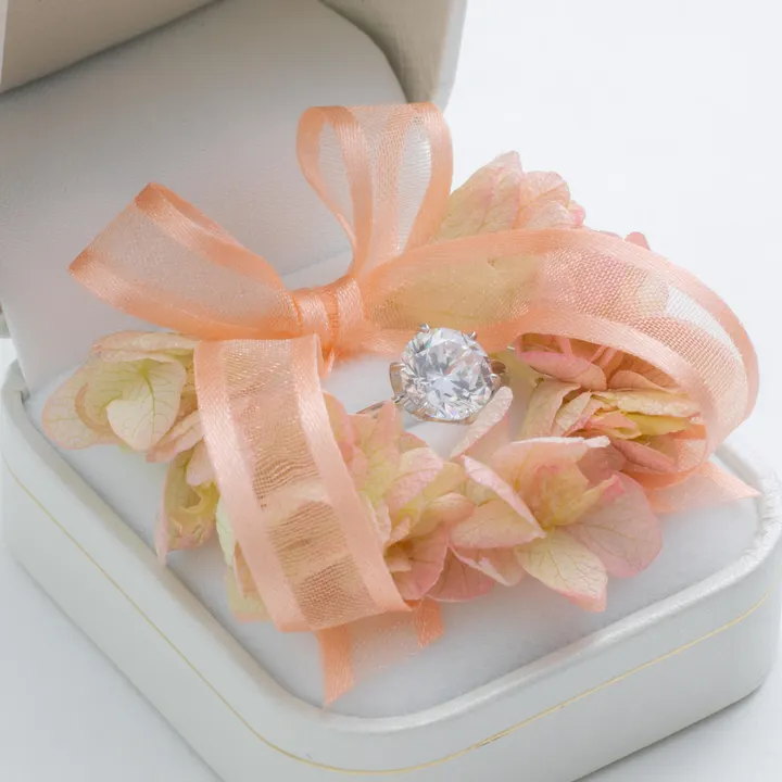 ※高温多湿の場所で保存しますと、他所への色移りの恐れがございます。プロポーズ前・特にプロポーズ成功後はフタを開けて保存いただきますよう、お願いたします。 ※リースの色・お花の雰囲気・イメージは統一していますが、全てプリザーブドフラワーとドライフラワーを使用した1点1点の手作り商品ですので、写真と若干仕様・色合いが異なる場合がございます。 ※プリザーブドフラワーは生花に特殊な加工を施し、枯れる事がなく数年美しい状態を楽しめる素材です。ドライフラワーは自然の花・葉などを乾燥させた素材です。どちらも保存状態により多少の色変わりがございます。 ※配送の際、稀に微量の素材塵がでる可能性がございます。お手数ですが、遠目からドライヤーの弱冷風を当てたり、ティッシュなどの柔らかい布等で吹き払ってください。 リングカラーとリングサイズは備考欄でご指定ください。 ※リースは繊細な作りとなっておりますので、リングケースの開閉等のお取り扱い際には、充分にご注意ください。 ※シルバー商品は空気中に含まれる成分・汗などに反応し、変色する特性がございます。月に一度ほど柔らかい布で拭くなど、お手入れください。