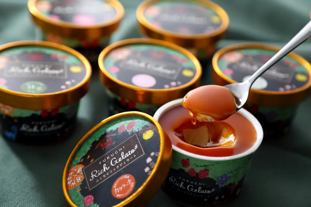 福岡県福智町のまちおこしブランドとして、町民の想いが詰まったジェラートです。カップのデザインが特徴的で消費者の目を引きます。