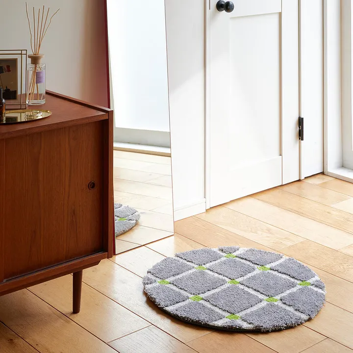 キャンパスに絵具代わりに糸で絵を描くかのように織られた、マシンフック製法でつくったマット。 糸をたっぷり使ったボリュームたっぷりのマットは、素足から感じるふかふかのボリューム感。 贅沢な踏み心地に思わず笑顔になるほど至福なひとときを感じられます。 格子状の柄に少しだけアクセントになる色を入れたアイテムは、インテリアに馴染みやすい優しい色合いで作られています。 ミラーの前にポイントとして敷いたり、愛犬や愛猫たちのゲージの前にポイントとして敷いてみたりと使い道は様々。 裏面にはすべりにくくする為の加工が施してますが、多少ズレても円形なのであまり気にならず、ストレスフリーなマットです。 手洗い可能で様々なシーンで長くお使いいただけます。 *裏面にすべりにくい加工