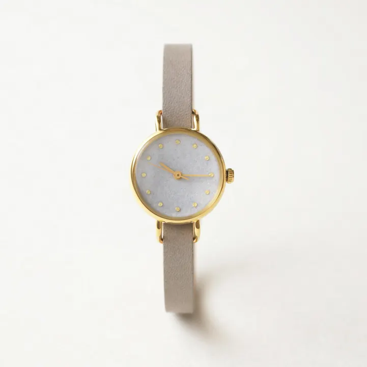 ソーダライト(和名:方ソーダ石)という鉱物を砕いて作った「岩絵具」を文字盤に塗った腕時計です。 「岩絵具」は、日本画を描く際に用いられ、7世紀ごろ高麗の僧が紙や墨とともに日本へ伝えたといわれている、 主に天然の鉱物を砕いて作る絵具です。普通の絵具にはない、透明感ある色彩と、粒子が粗くザラザラとした独特の質感をお楽しみいただけます。 ■ベルトサイズはレディース(手首周り15-16cm対応)を基準に制作しています。 【仕様】 ■素材 / 時計本体(日常生活防水):ステンレス、強化ガラス ベルト:牛革、ステンレス ■サイズ / 文字盤:直径22mm(リューズ部分含まず)、厚さ7mm、幅約0.7cm ベルト:内周約13.5~17cm(7段階調節可能) ※ベルトを含む腕時計の重量:約12g ※ベルトの色:No.24 ライトグレー ※ムーブメント:クオーツ式(セイコーエプソン社製、国産) ※保証書付き(一年間) ※ベルトは、レディースサイズ(手首まわり14.5~16.5cm)を基準に製作しています。 ※文字盤は天然素材を使用し、手作りですので個体差があります。 ※ベルトは、本革のため、表面に独特のしわや凹凸、多少の傷・光沢・色ぶれ・色むらなどが出ることがあります。