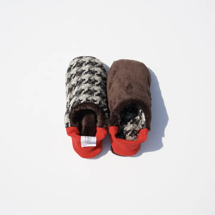 大きい千鳥柄はざっくり編み込まれていて遠くからでも目を引きます。 肉厚な千鳥の生地と滑らかなファーは履いていて気持ちが良いです。 ※受注生産のため現在の在庫についてはお問い合わせくださいませ。