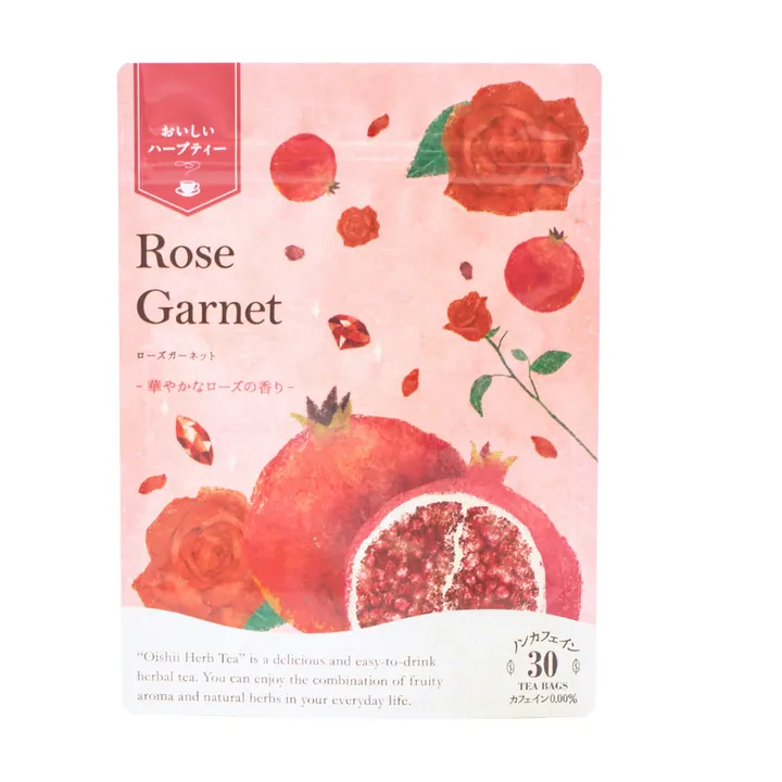 ハーブ本来の風味と特徴をそのままに、フルーツやフレーバーを加え、飲みやすく、おいしさを追求したハーブティーです。 ガーネット(ざくろ石)は1月の誕生石。 ローズはクレオパトラの時代より、世界の美女に愛されてきました。 美しく、輝きたいあなたへ。ローズの香りと、ザクロ、ハイビスカスの酸味をお楽しみください。 華やかな配色のパッケージで女性へのギフトにもおすすめです。  ノンカフェイン(カフェイン0.00%) 10個入(ティーバッグ)は個包装です。 30個入と100個入は個包装ではありません。