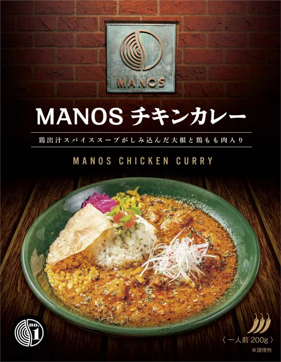 人気定番メニュー『MANOS チキンカレー』は、スパイスをガッツリ効かせた鶏肉と、鶏の出汁を染み込ませた大根の和の味わいのあるカレー。