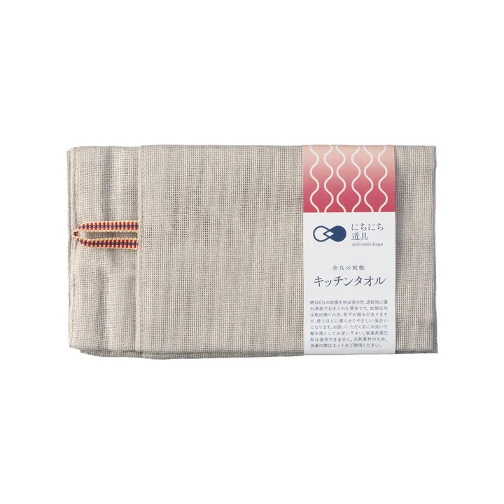 日々ふきんでお馴染みの、3枚重ねのかや生地でたっぷり拭けるキッチンタオルにしました。長辺の中央に真田紐のループをつけて、ちょっとひっかけておくのに便利な仕様になっています。