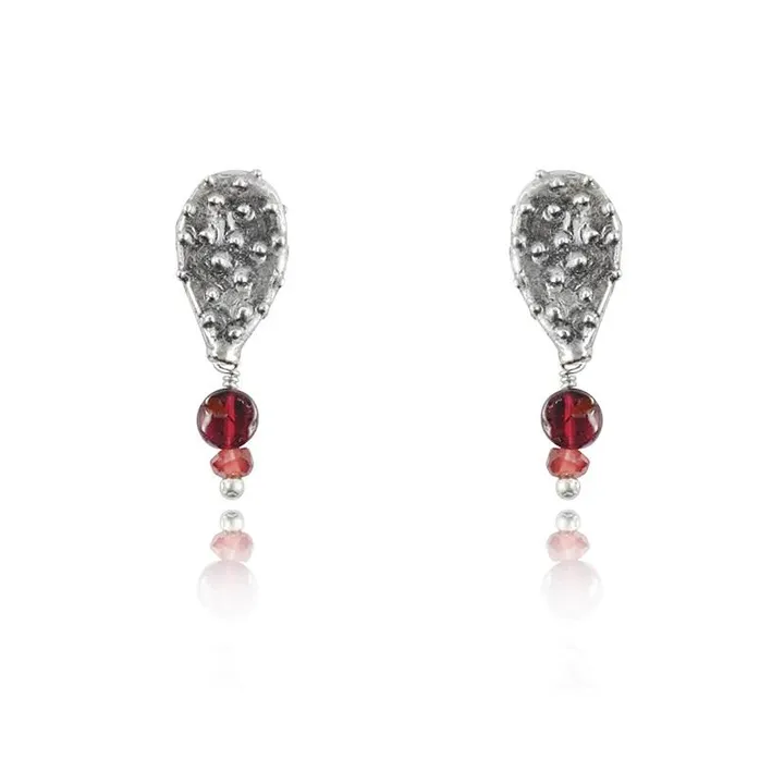 リアルなうちわサボテンのチャームに 深く美しいガーネットを2粒合わせた個性的なピアス