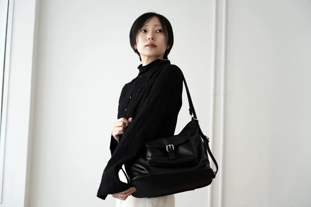 柔らかいカーフスキンの様な合成皮革。生活寄り添ってくれる2wayワンショルダー×リュックバッグ まるでカーフスキンのように柔らかく、シボの少ないマットな質感の合成皮革を使用。 光沢が抑えられた上品さで服に馴染みやすく、雨や汚れもサッと拭ける毎日使うのに最適な素材です。 ショルダーを伸ばせばリュックとしても使える2way仕様。 普段使いには十分な容積があり、タブレット、手帳、500mlボトル、子どもの着替えなども収納可能です。 前ポケットにはスマホや鍵、モバイルバッテリーなど取り出しやすく設計しています。 通勤からお子様の送迎、公園や買い物まで、忙しい一日を軽やかに過ごせる一品です。