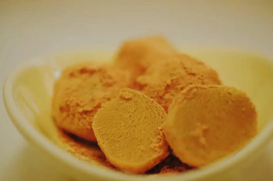 大正10年創業ワタトーによる伝統菓子。昔ながらのきなこ棒を丸く仕上げました。 ほどよい甘みが特徴です。 ハラール認証品。
