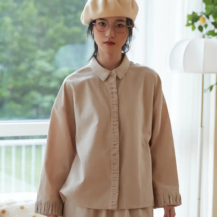 ギャザーのデザインが特徴な、ナチュラルスタイルのシャツです。シャツの袖口と前立てに施されたギャザーは、個性的なアクセントとなっています。ギャザーによる立体感と繊細なディテールが、シンプルながらも特別感を与えてくれます。リネンコットンミックス素材を使用しており、柔らかさと通気性、吸湿性や速乾性にも優れており、暑い季節でも快適に着用できます。 このシャツには、セットアップのパンツも用意されています。パンツも同じリネンコットンミックス素材で作られており、シャツとのコーディネートがおすすめです。セットアップとして着用すれば、シンプルながらもおしゃれで統一感のあるスタイリングを楽しむことができます。 この商品はBEIGE、RASPBERRY、BLACKの三色展開です。 #天然素材#エシカルファッション#エシカルライフ#セットアップ#ナチュラル系#大人かわいい#大人ガーリー#レトロガーリー#OEM#小ロット生産#リネン綿#リネンミックス#ベージュ系#黒系#通気性#長袖シャツ#ワイドパンツ#新着商品#春秋にも使える#レディースシャツ#レディースパンツ#シンプル#ミニマル#定番#人気商品#おすすめ#初秋#冷房対策#日焼け対策#羽織#日焼け防止