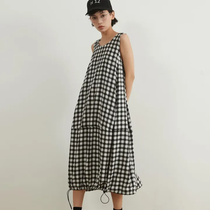 アジャスターチップ付きの裾しぼりバルーンスタイルワンピースです。ぐるりと裾を絞ってバルーンで着ても面白いし、そのまま広げてAラインをゆったりと楽しむのもお薦めです。とてもソフトな柔らかいチェック織りの生地を使用し、軽くゆれ感のある着心地抜群の一枚となりました。両サイドポケット付きで便利です。 サイズ  着丈  バスト  肩幅 cm S    110   96    30  M    112   100    31  素材:レーヨン65% ポリエステル35% 透け感:なし 生地の厚さ:普通 光沢感:なし 裏地:なし 家庭洗濯:可能(ネット使用) 【注意点】 ※撮影商品はサンプルの為、実際の仕様と異なる場合がございます。 ※画像の商品は光の照射や角度、お使いのモニター環境により、実物と色味が異なる場合がございます。スタジオ物撮りの画像が実物の色味に一番近くなっております。 ※予約商品の場合、お届け予定はあくまでも目安となります。 生産の都合上、お届け時期がずれる場合がございますので、あらかじめご了承ください。 ※表記サイズは商品の実寸です。 ※布製品の特性上、サイズ表の実寸法は多少の誤差が生じる場合がございますので、予めご了承ください。 ※デリケートな生地のため手洗いがお薦めです。 #ononesown#チェックワンピース#白黒チェック#バルーンワンピース#裾しぼり#裾しぼりバルーンワンピース #ノースリーブワンピース#ポケット付きワンピース#ルーズフィット#レイヤード
