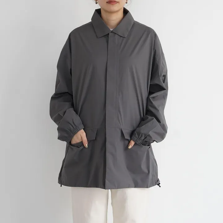 ストリートでのスタイリングに合わせやすい、取り外し可能なフード付きコーチジャケットタイプ。 本格アウトドア用に匹敵する耐水圧と透湿性を備えた「BARRIER EFFECT.」によって水分含浸を防ぎつつ、衣服内の蒸れを素早く解消してくれる。 周囲に溶け込む素材とカラーリングの反射プリント(リフレクター)には、極力機能性・安全性とデザイン性を両立させるための工夫が施されている。 ポケットは大きめのフラップに、デザイン性の高いスナップボタンのハンドポケットが左右に2つ。 左のポケットを裏返して本体を収納するパッカブル仕様。