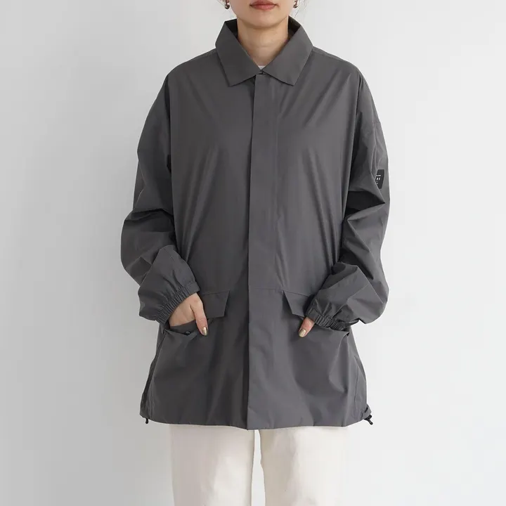 ストリートでのスタイリングに合わせやすい、取り外し可能なフード付きコーチジャケットタイプ。 本格アウトドア用に匹敵する耐水圧と透湿性を備えた「BARRIER EFFECT.」によって水分含浸を防ぎつつ、衣服内の蒸れを素早く解消してくれる。 周囲に溶け込む素材とカラーリングの反射プリント(リフレクター)には、極力機能性・安全性とデザイン性を両立させるための工夫が施されている。 ポケットは大きめのフラップに、デザイン性の高いスナップボタンのハンドポケットが左右に2つ。 左のポケットを裏返して本体を収納するパッカブル仕様。