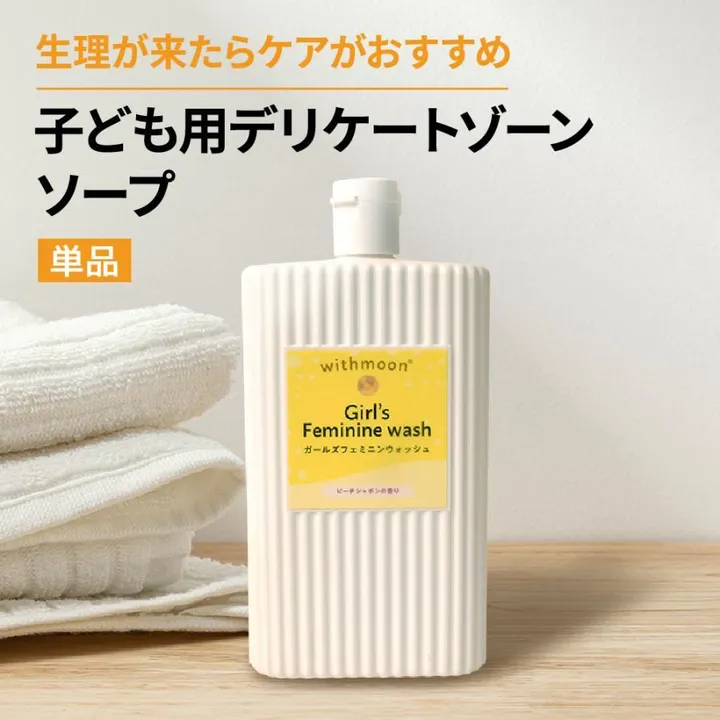【親子で使える!withmoon ガールズフェミニンウォッシュ】初潮を迎える小学生・中学生の子供(子ども)に向けた「はじめてのデリケートゾーンケア」としておすすめのデリケートゾーンソープです。デリケートゾーンケアは早くから習慣化することが大切です。そんな生理が始まったタイミングに、自分の体と向き合い、デリケートゾーンケアをスタートするきっかけにして頂きたいという想いで開発した商品です。お母さんやお父さんが子供用に選びやすいマイルドな使い心地で、もちろん大人の方のVIOソープ、フェムケアソープとしても大活躍します。気になる生理中の匂い対策や、普段の臭いケア、おりものの不快感、デリケートゾーンの乾燥によるかゆみにお悩みの方へ、弱酸性ボディソープとして繊細なデリケートゾーンにあった処方になっています。しっかり泡立てて優しく洗えるため、一般的な石鹸で刺激を感じる方、おりものシートを日常的に使う方にも寄り添う優しい処方。 ※当店検索用ワード※ デリケートゾーン 生理 初潮 子供 小学生 中学生 性教育 お試し フェムテック フェムケア VIOケア デリケートゾーンケア 女性用 膣ケア 外陰部 腟内フローラ
