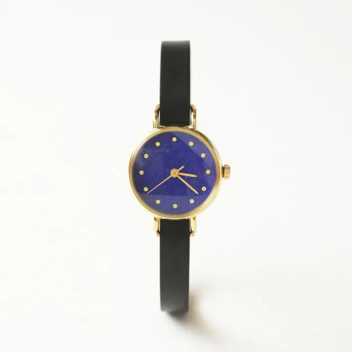 アズライト(和名:藍銅鉱)という鉱物を砕いて作った「岩絵具」を文字盤に塗った腕時計です。 「岩絵具」は、日本画を描く際に用いられ、7世紀ごろ高麗の僧が紙や墨とともに日本へ伝えたといわれている、 主に天然の鉱物を砕いて作る絵具です。普通の絵具にはない、透明感ある色彩と、粒子が粗くザラザラとした独特の質感をお楽しみいただけます。 ■ベルトサイズはレディース(手首周り15-16cm対応)を基準に制作しています。 【仕様】 ■素材 / 時計本体(日常生活防水):ステンレス、強化ガラス ベルト:牛革、ステンレス ■サイズ / 文字盤:直径22mm(リューズ部分含まず)、厚さ7mm、幅約0.7cm ベルト:内周約13.5~17cm(7段階調節可能) ※ベルトを含む腕時計の重量:約12g ※ベルトの色:No.8 ブラック ※ムーブメント:クオーツ式(セイコーエプソン社製、国産) ※保証書付き(一年間) ※ベルトは、レディースサイズ(手首まわり14.5~16.5cm)を基準に製作しています。 ※文字盤は天然素材を使用し、手作りですので個体差があります。 ※ベルトは、本革のため、表面に独特のしわや凹凸、多少の傷・光沢・色ぶれ・色むらなどが出ることがあります。