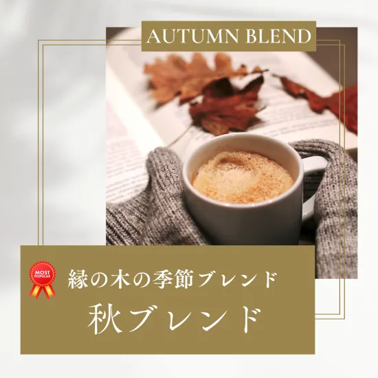 秋を感じる、柔らかで香り豊かな季節限定ブレンド 縁の木の季節限定ブレンドの中でも、一番人気を誇るのが秋ブレンドです。 モカの独特な香りを引き立て、爽やかさをプラスするコロンビアに、甘みを加えるブラジルとグアテマラを少しずつブレンド。モカの強いコクを抑え、柔らかで優しい味わいに仕上げました。秋らしいほっとする一杯をお楽しみいただけます。 深煎りにしてしまうとコロンビアの苦みが強くなり、ブレンドのバランスが崩れてしまうため、深煎りはご提供しておりません。焙煎をお任せいただいた場合は、バランスの良いハイローストでお届けします。この秋限定の柔らかなコーヒーを、ぜひお試しください。 生豆もご用意しております。お気軽にご相談ください。