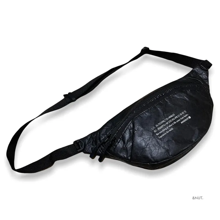 高密度ポリエチレン繊維不織布素材のウエストバッグです。 ていうか、高密度ポリエチレン繊維不織布素材ってなんなの?って感じですよね。 主な特徴は、軽くて、水に強く、強度があって、ムレにくいこと。 最初は紙のような見た目と質感ですが、一度手でほぐすとシワができ柔らかくなり本来の質感になります。 軽くて持ち運びがしやすく丈夫なので、エコバッグや旅行ポーチなどにも最適な素材なんです。 WAIST BAG自体は、フロントにジップが2本あり内側の大きな荷室とフロントポケットに分かれています。 バッグの両脇にDカンが付いているので、カラビナなどを用いキーホルダーやコインパースなどをぶら下げておくこともできます。 また本体裏、身体にあたる側にもジップポケットを配置。 スマホや、海外旅行などでパスポートを入れておいたりするのにピッタリです。 Product Description A waist bag made from high-density polyethylene nonwoven fabric. Sounds technical, but it simply means the material is lightweight, water-resistant, durable, and breathable. It starts with a paper-like look and feel, then softens and develops natural wrinkles once you break it in by hand. Light, tough, and easy to carry, this fabric is often used for eco bags and travel pouches, making it ideal for everyday use. The WAIST BAG features two front zippers, separating the main compartment and a front pocket. D-rings on both sides allow you to attach keychains, coin purses, or other accessories with a carabiner. There’s also a rear zip pocket on the body-facing side—perfect for storing a smartphone or a passport while traveling.