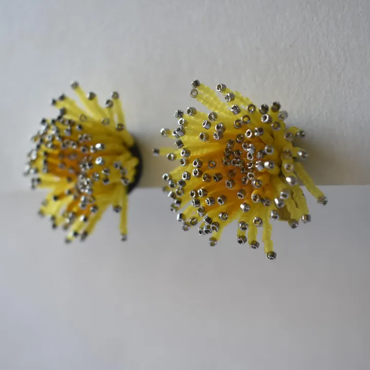 春先に側溝の隙間や 電柱の足もとなど どこからやってきたのか狭いところに 大胆に咲いているタンポポ 綿毛になる前の鮮やかで 力強い色のグラデーションを切り取りました *こちらの商品は、お客さまの耳の形状やピアスホールの位置によっては、装着位置がご満足いただけない場合がございます。 material SILVER925(ピアス金具)、ガラスビーズ、銀糸、真鍮、チタン、フェルト、本革、シリコン *シルバービーズはパラジウムメッキ加工を施したものを使用しております *下地カラーはベージュに変更しております size 約Φ30x17㎜ weight 約4.6g *CACICOの商品は全て1点1点制作しているため、個体差があり、商品写真と差がある場合がございます。ご了承の上、ご購入ください。 *金属アレルギーの方はご使用をお控えください *受注生産のため、ご注文確定後1週間~10日以内に商品を発送いたします