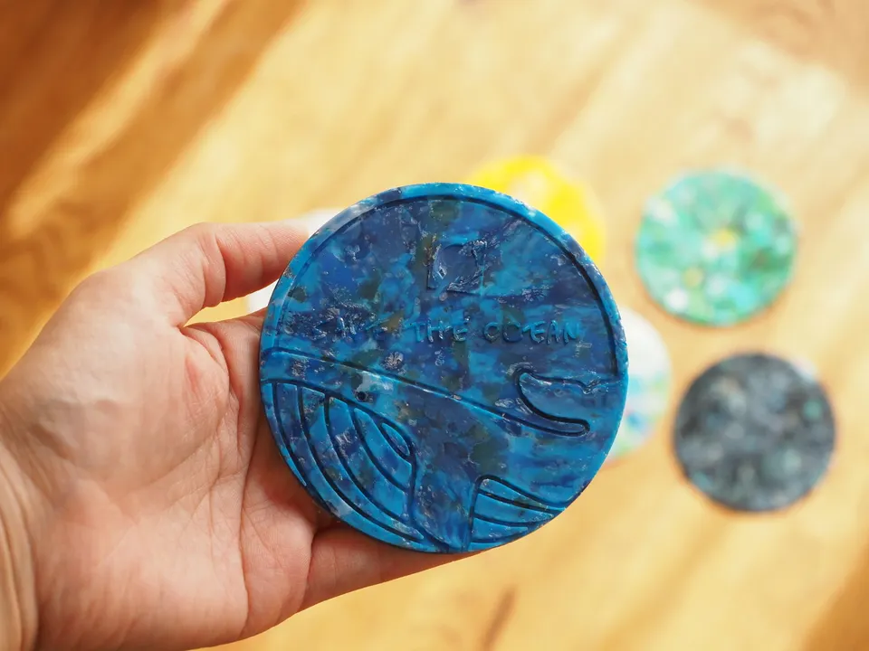 【海洋プラスチックごみ、ほぼ100%で作られたプロダクト】 独自の成形方法により、ゴミが持っていた色をそのままに一つずつ異なる色・模様を持っています。