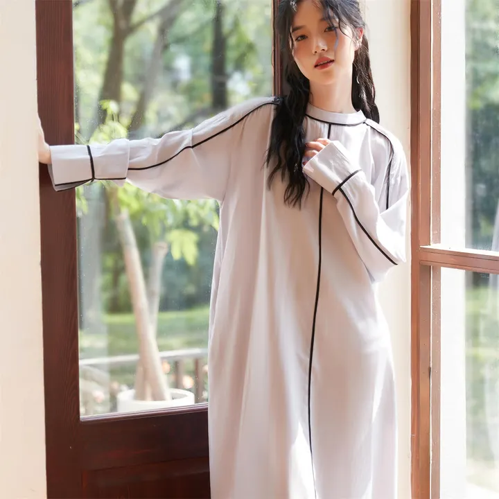 センターと袖に加えられたパイピングラインのデザインがこのワンピースの特徴です。パイピングラインは細かな縁取りの役割を果たし、ワンピースに繊細さとエレガンスを与えてくれます。シャドーストライプ生地は上品な印象を与えながらも、微細なストライプ模様が動きをプラスし、洗練されたスタイルを演出します。また、長袖のデザインは季節を問わず着用でき、袖口を捲って、足元をスニーカーでラフな着こなしに合わせることも出来ます。バックにコンシールファスナー付き。両サイドポケット付きです。 #アップサイクル#エシカルコレクション#エシカルライフ#ナチュラル系#大人かわいい#大人ガーリー#レトロガーリー#OEM#小ロット生産#黒系#ドレープ#長袖ワンピース#体系カバー#新着商品#春秋にも使える#レディースワンピ#パイピング#シンプル#ミニマル#定番#人気商品#おすすめ#ロング丈ワンピース