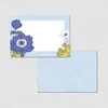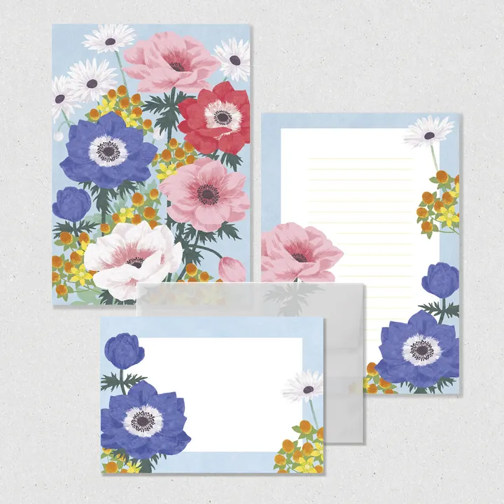 咲き誇る花々が鮮やかに描かれた便箋と封筒のセット。 差し色の罫線もアクセントになっています。 封筒は同柄のイラストのものが2枚と、トレーシングペーパー素材の2枚組みにしました。 切手を貼る際は右上になるので、イラスト封筒のお花の配置にも気をつけています。 もちろん手渡しでも違和感ないようにデザインしています。 半透明の封筒は便箋を入れると透けて見えるので、また違った印象に。 ※半透明の封筒は糊がはがれやすいため、切手や封、シールをご使用の際はしっかりと貼付けてください。 便箋が余ってしまったら、封筒の内側に合わせてカットして中紙として使うのも面白いかもしれません。 色々な遊びをお試しください。 【アネモネ】 アネモネの花言葉はギリシャ神話に由来する愛にまつわるものが中心ですが、 色ごとでは違った意味が含まれるので、様々なシーンで使えるように色を混ぜ込みました。 ピンク「希望」 白「希望」「期待」「真実」 赤「燃え上がる情熱」 青「固い誓い」 など 【フリージアとスイートピー】 花言葉は、「親愛の情」「友情」「感謝」「期待」など スイートピーは「門出」「優しい思い出」「永遠の喜び」「蝶のような飛翔」など 【プロテア】 花言葉は、「風格」「自由自在」「華やかな期待」「栄光」「甘い恋」など ユーカリは「再生」「新生」「思い出」「記憶」「追憶」「慰め」など 想いを綴る時に、花言葉をイメージした一言を添えてみるのもいいかもしれませんね。 内容:便箋 10枚、イラスト封筒 2枚、半透明封筒 2枚 便箋サイズ:148×210mm 封筒サイズ:洋2 162×114mm 定形郵送可